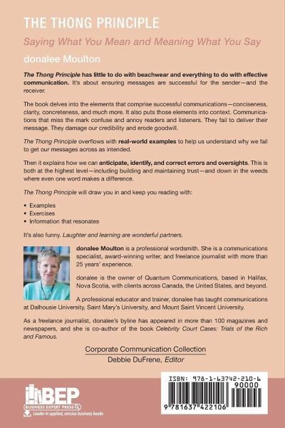 The Thong Principle has little to do with beachwear and everything to do with effective communication. It's about ensuring messages are successful for the sender - and the receiver. The book delves into the elements that comprise successful communications - conciseness, clarity, concreteness, and much more. It also puts those elements into context. Communications that miss the mark confuse and annoy. They fail to deliver their message. They damage our credibility and erode goodwill. The Thong Principle overflows with real-world examples to help us understand why we fail to get our messages across as intended. Then it explains how we can anticipate, identify, and correct errors and oversights. This is both at the highest level - including building and maintaining trust - and down in the weeds where even one word makes a difference. The Thong Principle will draw you in and keep you reading with:Examples Exercises Information that resonates. It's also funny. Laughter and learning are wonderful partners.