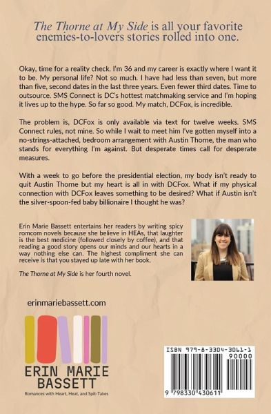 The Thorne at My Side is all your favorite enemies-to-lovers romantic comedies rolled into one. Okay, time for a reality check. I'm 36 and my career is exactly where I want it to be. My personal life? Not so much. I have had less than seven, but more than five, second dates in the last three years. Even fewer third dates. Time to outsource. SMS Connect is DC's hottest matchmaking service and I'm hoping it lives up to the hype. So far so good. My match, DCFox, is incredible. The problem is, DCFox is only available via text for twelve weeks. SMS Connect rules, not mine. So while I wait to meet him I've gotten myself into a no-strings-attached, bedroom arrangement with Austin Thorne, the man who stands for everything I'm against. But desperate times call for desperate measures. With a week to go before the presidential election, my body isn't ready to quit Austin Thorne but my heart is all in with DCFox. What if my physical connection with DCFox leaves something to be desired? What if Austin isn't the silver-spoon-fed baby billionaire I thought he was? Tropes & Microtropes: Enemies-to-Lovers, Enemies-with-Benefits, Workplace Chemistry, MMC Wears Glasses, and Suits, "Good Girl", Textual Relationship, Spicy Romance
