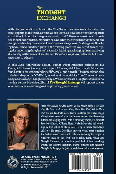 With the proliferation of books like "The Secret," we now know that what we think appears in the world as what we see there. So how come we're having such a hard time holding the thoughts we want to hold? How come we take on a positive thought only to find, moments or days later, that we're back to the same old thought and seeing the same old results we've always seen. In this groundbreaking book, David Friedman gives us the missing piece, the real secret to identifying the underlying thoughts we're actually thinking, exchanging them, and being able to stay with them and see the results we've always wanted to see but never knew how to achieve. In this 20th Anniversary edition, author David Friedman reflects on his Thought Exchange journey over the past 20 years, which has brought him a profound shift in his understanding of life, goals, and himself. This new edition also includes a chapter on COVID-19, as well as tips and tidbits from 20 years of practicing and teaching Thought Exchange. Whether you are a longtime student or a new learner, we hope his edition of The Thought Exchange will support you on your journey to discovering and empowering your true self.
