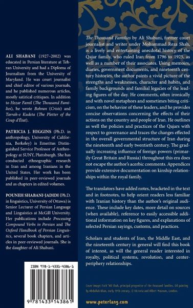 The Thousand Families by Ali Shabani, former court journalist and writer under Mohammad Reza Shah, is a lively and entertaining anecdotal history of the Qajar family, who ruled Iran from 1796 to 1925, as well as a number of their associates. Using memoirs, diaries, government documents, and nineteenth century histories, the author paints a vivid picture of the strengths and weaknesses, character and habits, and family backgrounds and familial legacies of the leading figures of the day. He comments, often ironically and with novel metaphors and sometimes biting criticism, on the behavior of these leaders, and he provides concise observations concerning the effects of their actions on the country and people of Iran. He outlines as well the policies and practices of the Qajars with respect to governance and traces the changes effected in the overall governmental structure of Iran during the nineteenth and early twentieth century. The gradually increasing influence of foreign powers (primarily Great Britain and Russia) throughout this era does not escape the author's acerbic comments. Appendices provide extensive documentation on kinship relationships within the royal family.