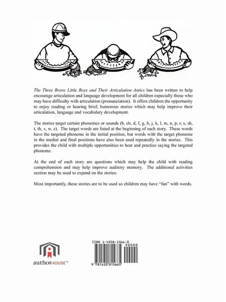 The Three Brave Little Boys and Their Articulation Antics has been written to help encourage articulation and language development for all children especially those who may have difficulty with articulation (pronunciation). It offers children the opportunity to enjoy reading or hearing brief, humorous stories which may help improve their articulation, language and vocabulary development. The stories target certain phonemes or sounds (b, ch, d, f, g, h, j, k, l, m, n, p, r, s, sh, t, th, v, w, z). The target words are listed at the beginning of each story. These words have the targeted phoneme in the initial position, but words with the target phoneme in the medial and final positions have also been used repeatedly in the stories. This provides the child with multiple opportunities to hear and practice saying the targeted phoneme. At the end of each story are questions which may help the child with reading comprehension and may help improve auditory memory. The additional activities section may be used to expand on the stories. Most importantly, these stories are to be used so children may have "fun" with words.