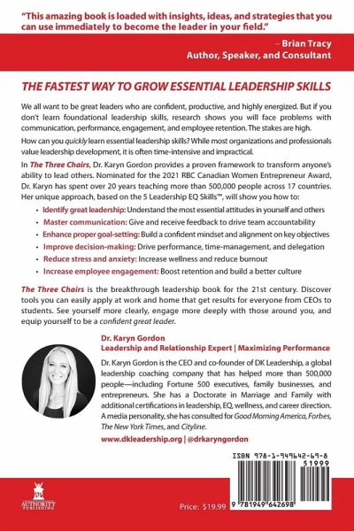 #2 WALL STREET JOURNAL BESTSELLER USA TODAY BESTSELLER #1 AMAZON BESTSELLER (In 9 Leadership, Business & HR Categories) ***Includes a free workbook, as well as discussion questions for use by students as well as teams*** "This amazing book is loaded with insights, ideas and strategies that you can use immediately to become the Leader in your field." Brian Tracy - Author, Speaker, Consultant "Dr. Karyn Gordon has written a must-read book for anyone wanting to develop great leadership skills both as an individual or as a development tool to support your team to build core skills of great leaders. The Three Chairs hooked me from the start with its engaging storytelling, scientific research and abundant actionable tools." Erin Lukie - Senior Global Director, Young Presidents' Organization (YPO) "Dr. Karyn is an incredible force for good when it comes to leadership, communication and building high performance teams. The Three Chairs: How Great Leaders Drive Communication, Performance and Engagement is a must read for leaders seeking to implement and an integrated, authentic and effective management process in their organizations, for their high performance teams and in their personal lives in a changing world." Scott O'Neil - CEO, Philadelphia 76ers (NBA) "Dr. Karyn's concept of The Three Chairs is brilliant in its simplicity. The way she applies it to leadership skills everywhere from the classroom to the boardroom shows her strong grasp of how leaders are not born, they are made." Michael Gelman - Executive Producer, "LIVE with Kelly and Ryan" The Fastest Way to Grow Essential Leadership Skills We all want to be great leaders who are confident, productive, and highly energized. But if you don't learn foundational leadership skills, research shows you will face problems with communication, performance, engagement, and employee retention. The stakes are high. How can you quickly learn essential leadership skills? While most organizations and professionals value leadership development, it is often time-intensive and impractical. In The Three Chairs, Dr. Karyn Gordon provides a proven framework to transform anyone's ability to lead others. Nominated for the 2021 RBC Canadian Women Entrepreneur Award, Dr. Karyn has spent over 20 years teaching more than 500,000 people across 17 countries. Her unique approach, based on the 5 Leadership EQ Skills(TM), will show you how to: Identify Great Leadership: Understand the most essential attitudes in yourself and others Master Communication: Give and receive feedback to drive team accountability Enhance Proper Goal-Setting: Build a confident mindset and alignment on key objectives Improve Decision-Making: Drive performance, time-management, and delegation Reduce Stress And Anxiety: Increase wellness and reduce burnout Increase Employee Engagement: Boost retention and build a better culture The Three Chairs is the breakthrough leadership book for the 21st century. Discover tools you can easily apply at work and home that get results for everyone from CEOs to students. See yourself more clearly, engage more deeply with those around you, and equip yourself to be a confident great leader.