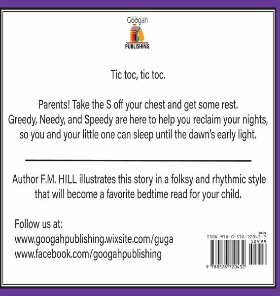 Tick toc, tic toc. Parents! Take the S off of your chest and get some rest. Greedy, Needy, and Speedy are here to help you reclaim your nights, so you and your little one can sleep until the dawn's early light. Author F.M. HILL illustrates this story in a folksy and rhythmic style that will become a favorite bedtime read for your child.