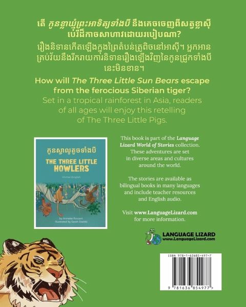 "The story, both familiar and fresh, is a clever example of how fables can enlarge our world view." - A. Ashbrook, Librarian, Long Hill, NJ How will The Three Little Sun Bears escape from the ferocious Siberian tiger? Set in the tropical rainforest in Asia, readers of all ages will enjoy this clever retelling of The Three Little Pigs. This book is available in English-only and many bilingual editions and includes teacher resources and English audio. This book is part of the Language Lizard World of Stories collection. These adventures are set in diverse areas and cultures around the world. The companion book in this collection is The Three Little Howlers by Anneke Forzani.