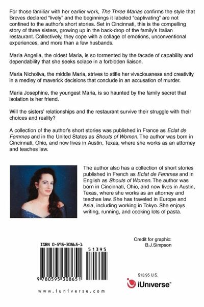 For those familiar with her earlier work, The Three Marias confirms the style that Breves declared "lively" and the beginnings it labeled "captivating" are not confined to the author's short stories. Set in Cincinnati, this is the compelling story of three sisters, growing up in the back-drop of the family's Italian restaurant. Collectively, they cope with a collage of emotions, unconventional experiences, and more than a few husbands. Maria Angelia, the oldest Maria, is so tormented by the facade of capability and dependability that she seeks solace in a forbidden liaison. Maria Nicholiva, the middle Maria, strives to stifle her vivaciousness and creativity in a medley of maverick decisions that conclude in an accusation of murder. Maria Josephine, the youngest Maria, is so haunted by the family secret that isolation is her friend. Will the sisters' relationships and the restaurant survive their struggle with their choices and reality? A collection of the author's short stories was published in France as Eclat de Femmes and in the United States as Shouts of Women. The author was born in Cincinnati, Ohio, and now lives in Austin, Texas, where she works as an attorney and teaches law.