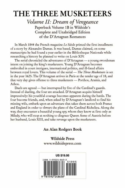 In March 1844 the French magazine Le Siecle, printed the first installment of a story by Alexandre Dumas. It was based, Dumas claimed, on some manuscripts he had found a year earlier in the Bibliotheque Nationale while researching a history he planned to write on Louis XIV. The serial chronicled the adventures of D'Artagnan -- a young swordsman intent on joining the king's musketeers. Young D'Artagnan becomes embroiled in court intrigues, international politics, and ill-fated affairs between royal lovers. This volume of the serial -- The Three Musketeers is set in the year 1625. The D'Artagnan arrives in Paris at the tender age of 18, and that very day gives offese to three musketeers -- Porthos, Aramis, and Athos. Duels are agreed -- but interrupted by five of the Cardinal's guards. Instead of dueling, the four are attacked. D'Artagnan acquits himself impressively: his youthful courage becomes apparent during the battle. The four become friends, and, when asked by D'Artagnan's landlord to find his missing wife, embark upon an adventure that takes them across both France and England in order to thwart the plans of the Cardinal Richelieu. Along the way, they encounter a beautiful young spy, whom they know at first only as Milady, who will stop at nothing to disgrace Queen Anne of Austria before her husband, Louis XIII, and take revenge upon the musketeers. (Volume II of II.)