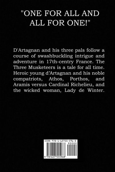 "ONE FOR ALL AND ALL FOR ONE!" D'Artagnan and his three pals follow a course of swashbuckling intrigue and adventure in 17th-centry France. The Three Musketeers is a tale for all time. Heroic young d'Artagnan and his noble compatriots, Athos, Porthos, and Aramis versus Cardinal Richelieu, and the wicked woman, Lady de Winter.