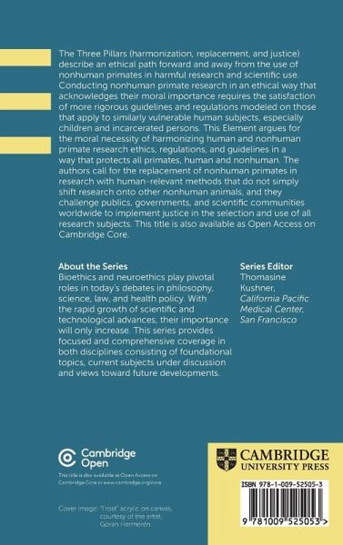 The Three Pillars (Harmonization, Replacement, and Justice) describe an ethical path forward and away from the use of nonhuman primates in harmful research and scientific use. Conducting nonhuman primate research in an ethical way that acknowledges their moral importance requires satisfying more rigorous guidelines and regulations modeled on those that apply to similarly vulnerable human subjects, especially children and incarcerated persons. This Element argues for the moral necessity of harmonizing human and nonhuman primate research ethics, regulations, and guidelines in a way that protects all primates, human and nonhuman. The authors call for the replacement of nonhuman primates in research with human-relevant methods that do not simply shift research onto other nonhuman animals, and challenge publics, governments, and scientific communities worldwide to implement justice in the selection and use of all research subjects. This title is also available as Open Access on Cambridge Core.