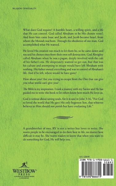 What does God require? A humble heart, a willing spirit, and a life that He can control. God called Abraham to be His chosen vessel. And from him came Isaac and Jacob, and Jacob became Israel, from whom the Messiah was born. Through the obedience of one man, God accomplished what He wanted. He loved His creation too much to let them be, so he came down and rescued his chosen ones from their own self destruction. God Almighty called Abraham when he was a pagan, deeply involved with the cult of his father's era. He desperately wanted to get out, but that was his culture and attempting to escape would have left Abraham with nothing. His father owned everything and was in control of Abraham's life. And if he left, where would he have gone? How about you? Are you trying to escape from the One that can give you what world can't give you? The Bible is my inspiration. I took a journey with my Savior and He has guided me to write this book to let others know how much He loves us. God is serious about saving souls, for it is said in John 3:16, "For God so loved the world that He gave His only begotten Son, that whoever believes in Him should not perish but have everlasting Life."