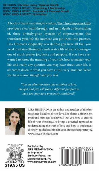 A book of beauty and simple wisdom that all can relate to, The Three Supreme Gifts provides a clear path and an in-depth understanding of the three supreme truths introduced in its companion book, Love is the Seed: Teachings from the Spirit World. Lisa Hromada eloquently illustrates that you have all you need to attain self-mastery and create a life of your choosing-one of much greater joy, ease, and inner peace-and improve any aspect of your life moving forward. The three supreme gifts help you to more consciously grow beyond negative karmic and thought patterns, which in turn not only changes the course of your life at the very moment you begin to apply these supreme gifts but forevermore. In Lisa's words, "You are about to delve into a subject of love, thought and free will from a different perspective than you may have previously considered." If you have ever wanted to know the meaning or purpose of your life, how to master or navigate your life, and really any question you may have about your life, it all comes down to what you have at this very moment. What you have are love, thought, and free will.