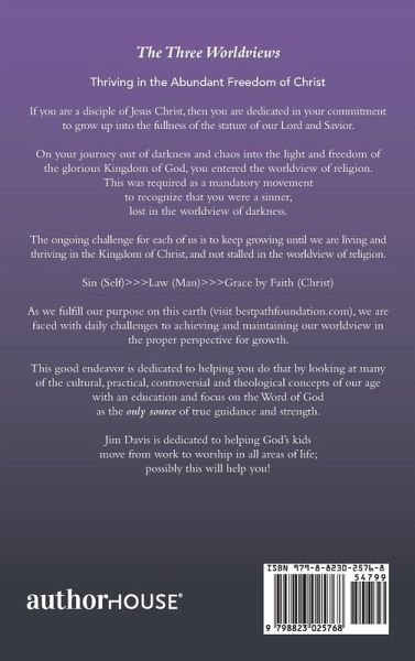The Three Worldviews Thriving in the Abundant Freedom of Christ If you are a disciple of Jesus Christ, then you are dedicated in your commitment to grow up into the fullness of the stature of our Lord and Savior. On your journey out of darkness and chaos into the light and freedom of the glorious Kingdom of God, you entered the worldview of religion. This was required as a mandatory movement to recognize that you were a sinner, lost in the worldview of darkness. The ongoing challenge for each of us is to keep growing until we are living and thriving in the Kingdom of Christ, and not stalled in the worldview of religion. Sin (Self)>Law (Man)>Grace by Faith (Christ) As we fulfill our purpose on this earth (visit bestpathfoundation.com), we are faced with daily challenges to achieving and maintaining our worldview in the proper perspective for growth. This good endeavor is dedicated to helping you do that by looking at many of the cultural, practical, controversial and theological concepts of our age with an education and focus on the Word of God as the only source of true guidance and strength. Jim Davis is dedicated to helping God's kids move from work to worship in all areas of life; possibly this will help you!