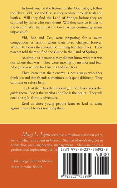 Follow the Three, Vid, Bec and Cee, as they venture through trials and battles. Will they find the Land of Springs before they are captured by those who seek them? Will they survive battles to the death? Will they trust the Giver when continuing seems impossible? Vid, Bec and Cee, were preparing for a sword competition at school when their lives changed forever. Within 48 hours they would be running for their lives. Their parents told them to find the Guide in the Land of Springs. As simple as it sounds, they did not know who that was nor where that was. They were moving by instinct and fear. Along the way they find friends and face foes. They learn that their enemy is not always who they think it is and that friends sometimes look quite different. They can trust or refuse help. Each of them has their special gift. Vid has visions that guide them. Bec is the warrior and Cee is the healer. They will need the gifts for this adventure. Read as three young people learn to lead an army against the evil forces torturing them.