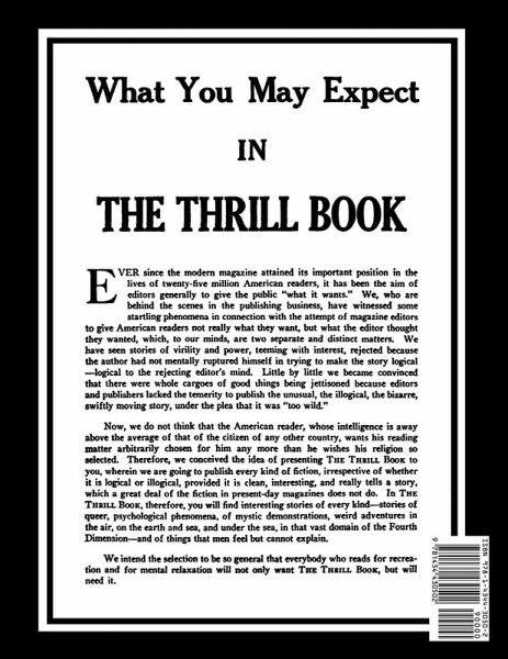 Running for sixteen issues in 1919, 'The Thrill Book' was a magazine of 'strange, bizzare, occult, mysterious tales,' but not quite a fantastic-fiction magazine, mixing various types of adventure stories with often outstanding fantasy, horror, and science fiction. This volume is a facsimile reprint of the first issue.