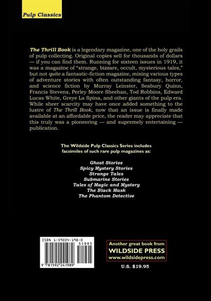 "The Thrill Book" is a legendary magazine, one of the holy grails of pulp collecting. Original copies sell for thousands of dollars -- if you can find them. Running for sixteen issues, it was a magazine of "strange, bizzare, occult, mysterious tales," but not quite a fantastic-fiction magazine, mixing various types of adventure stories with often outstanding fantasy, horror, and science fiction by Murray Leinster, Seabury Quinn, Francis Stevens, Perley Moore Sheehan, Tod Robbins, Edward Lucas White, Greye La Spina, and other giants of the pulp era. While sheer scarcity may have once added something to the lustre of "The Thrill Book," now that an issue is finally made available at an affordable price, the reader may appreciate that this truly was a pioneering -- and supremely entertaining -- publication.