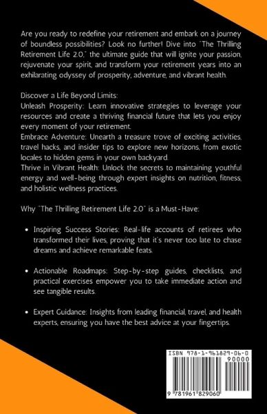 The Thrilling Retirement Life 2.0: Unleash Prosperity, Embrace Adventure, and Thrive in Vibrant Health Are you ready to redefine your retirement and embark on a journey of boundless possibilities? Look no further! Dive into The Thrilling Retirement Life 2.0, the ultimate guide that will ignite your passion, rejuvenate your spirit, and transform your retirement years into an exhilarating odyssey of prosperity, adventure, and vibrant health. Discover a Life Beyond Limits Unleash Prosperity: Learn innovative strategies to leverage your resources and create a thriving financial future that lets you enjoy every moment of your retirement. Embrace Adventure: Unearth a treasure trove of exciting activities, travel hacks, and insider tips to explore new horizons, from exotic locales to hidden gems in your own backyard. Thrive in Vibrant Health: Unlock the secrets to maintaining youthful energy and well-being through expert insights on nutrition, fitness, and holistic wellness practices. Why The Thrilling Retirement Life 2.0 is a Must-Have: · Inspiring Success Stories: Real-life accounts of retirees who transformed their lives, proving that it's never too late to chase dreams and achieve remarkable feats. · Actionable Roadmaps: Step-by-step guides, checklists, and practical exercises empower you to take immediate action and see tangible results. · Expert Guidance: Insights from leading financial, travel, and health experts, ensuring you have the best advice at your fingertips. Your Adventure Awaits Act Now! Don't let retirement be a mere pause; make it an extraordinary chapter filled with excitement, growth, and fulfillment. Grab your copy of The Thrilling Retirement Life 2.0 today and embark on a journey that promises prosperity, adventure, and vibrant health like never before. Seize this opportunity to create the retirement of your dreams - your best life is just a click away! Click the Add to Cart button and let the adventure begin! ¿