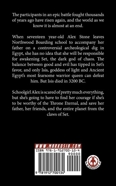 The participants in an epic battle fought thousands of years ago have risen again, and the world as we know it is almost at an end. When seventeen year-old Alex Stone leaves Northwood Boarding school to accompany her father on a controversial archeological dig in Egypt, she has no idea that she will be responsible for awakening Set, the dark god of chaos. The balance between good and evil has tipped in Set's favor, and only Isis, goddess of light and Ancient Egypt's most fearsome warrior queen can defeat him. But Isis died in 3200 BC. Schoolgirl Alex is scared of pretty much everything, but she's going to have to find her courage if she's to be worthy of the Throne Eternal, and save her father, her friends, and the entire planet from the claws of Set.