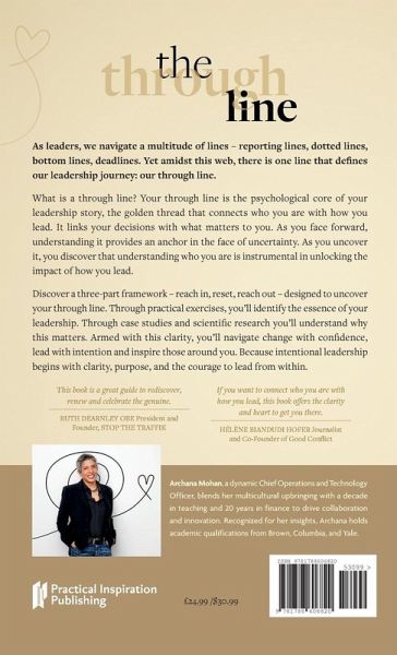 As leaders, we navigate a multitude of lines - reporting lines, dotted lines, bottom lines, deadlines. Yet amidst this web, there is one line that defines our leadership journey: our through line. What is a through line? Your through line is the psychological core of your leadership story, the golden thread that connects who you are with how you lead. It links your decisions with what matters to you. As you face forward, understanding it provides an anchor in the face of uncertainty. As you uncover it, you discover that understanding who you are is instrumental in unlocking the impact of how you lead. Discover a three-part framework - reach in, reset, reach out - designed to uncover your through line. Through practical exercises, you'll identify the essence of your leadership. Through case studies and scientific research you'll understand why this matters. Armed with this clarity, you'll navigate change with confidence, lead with intention and inspire those around you. Because intentional leadership begins with clarity, purpose, and the courage to lead from within. 'This book is a great guide to rediscover, renew and celebrate the genuine.' - Ruth Dearnley OBE, President and Founder, STOP THE TRAFFIK 'If you want to connect who you are with how you lead, this book offers the clarity and heart to get you there.' HÉLÈNE BIANDUDI HOFER, Journalist Archana Mohan, a dynamic Chief Operations and Technology Officer, blends her multicultural upbringing with a decade in teaching and 20 years in finance to drive collaboration and innovation. Recognized for her insights, Archana holds academic qualifications from Brown, Columbia, and Yale.