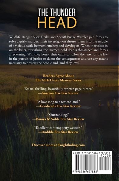 THE THUNDER HEAD (THE NICK DRAKE MYSTERIES BOOK 9) A murder. A land grab. A won't see it coming ending. The explosive return of Nick Drake. Wildlife Ranger Nick Drake and Sheriff Pudge Warbler join forces to solve a grisly murder. Their investigation thrusts them into the middle of a vicious battle between ranchers and developers over a beautiful valley. When they close in on the killer, everything the lawmen hold dear is threatened and forces a reckoning. Will they honor their oaths to follow the letter of the law in the pursuit of justice or damn the consequences and use any means necessary to protect the people and land they love? Whatever their decision, one thing is certain. While the Wild West lives on in Harney County, Oregon, not everyone in this fight will.