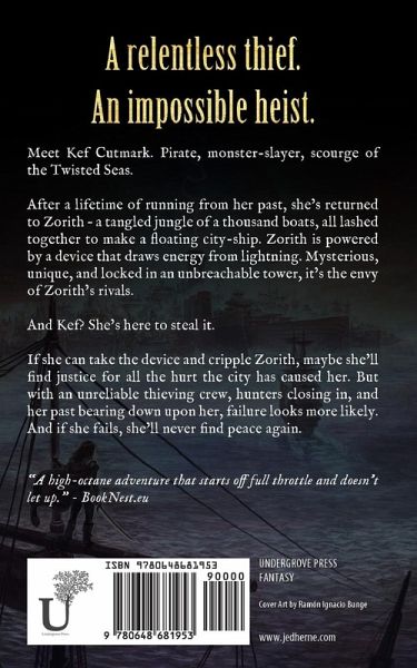 A relentless thief. An impossible heist. Meet Kef Cutmark. Pirate, monster-slayer, scourge of the Twisted Seas. After a lifetime of running from her past, she's returned to Zorith - a tangled jungle of a thousand boats, all lashed together to make a floating city-ship. Zorith is powered by a device that draws energy from lightning. Mysterious, unique, and locked in an unbreachable tower, it's the envy of Zorith's rivals. And Kef? She's here to steal it. If she can take the device and cripple Zorith, maybe she'll find justice for all the hurt the city has caused her. But with an unreliable thieving crew, hunters closing in, and her past bearing down upon her, failure looks more likely. And if she fails, she'll never find peace again.
