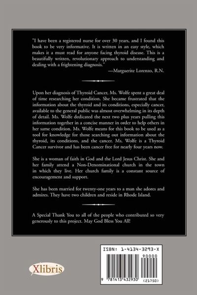 "I have been a registered nurse for over 30 years, and I found this book to be very informative. It is written in an easy style, which makes it a must read for anyone facing thyroid disease. This is a beautifully written, revolutionary approach to understanding and dealing with a frightening diagnosis." Marguerite Lorenzo, R.N. Upon her diagnosis of Thyroid Cancer, Ms. Wolfe spent a great deal of time researching her condition. She became frustrated that the information about the thyroid and its conditions, especially cancer, available to the general public was almost overwhelming in its depth of detail. Ms. Wolfe dedicated the next two plus years pulling this information together in a concise manner in order to help others in her same condition. Ms. Wolfe means for this book to be used as a tool for knowledge for those searching out information about the thyroid, its conditions, and the cancer. Ms. Wolfe is a Thyroid Cancer survivor and has been cancer free for nearly four years now. Book Orders Can Be Fulfilled Beginning October 31st.