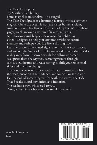 The Tide That Speaks by Matthew Petchinsky Some magick is not spoken-it is surged. The Tide That Speaks is a haunting journey into sea-sentient magick, where the ocean is not just water but an ancient, conscious force that listens, dreams, and replies. Within these pages, you'll uncover a system of trance, saltwork, sigil-drawing, and deep-water invocation unlike any other-designed to help you commune with the ocean's memory and reshape your life like a shifting tide. Learn to create brine-based sigils, enter water-sleep trances, and awaken the Voice of the Tide-a vocal current that speaks reality into form. Discover rituals for calling unnamed sea-spirits from the Mythos, receiving visions through salt-soaked dreams, and wavecasting to shift your emotional tides and manifest change. This is not a book of surface spells. It is a transmission from the deep, encoded in salt, silence, and sound. For those who feel the pull of something vast beneath the waves, The Tide That Speaks is both invitation and initiation. The sea has always whispered to you. Now, at last, it teaches you how to whisper back.