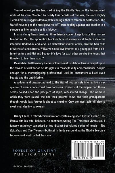 Turmoil envelops the lands adjoining the Middle Sea on the two-mooned world of Trascera. Wracked by nearly four decades of civil war, the once mighty Tieran Empire staggers down a path leading either to rebirth or destruction. The War of Houses pits the most powerful of Tieran nobility against one another in a struggle as interminable as it is bloody. In a far-flung Tieran territory, three friends come of age to face their uncertain future. Mat, the apprentice blacksmith, must answer a call to duty while his intended, Bodewhin, and Jaryd, an ambivalent student of law, face the twin coils of witchcraft and sorcery. Will Jaryd's new love interest to a young girl from a different culture and Mat and Bodewhin's love for each other survive the forces that threaten to tear them apart? Meanwhile, battle-weary Tieran soldier Quintus Glabrio Jens is caught up in the travails of civil war as he struggles to reconcile duty and conscience. Simple enough for a thoroughgoing professional, until he encounters a black-eyed beauty and the unthinkable. A sudden and unexpected end to the War of Houses sets into motion a sequence of events none could have foreseen. Citizens of the empire find themselves poised upon the precipice of rapid, widespread change. The world in which they were raised, the one their parents knew, and their grandparents thought would last forever is about to crumble. Only the most able will rise to meet what destiny so reveals.
