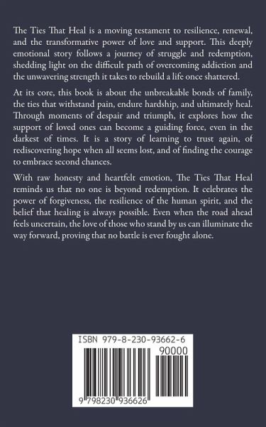 The Ties That Heal is a moving testament to resilience, renewal, and the transformative power of love and support. This deeply emotional story follows a journey of struggle and redemption, shedding light on the difficult path of overcoming addiction and the unwavering strength it takes to rebuild a life once shattered. At its core, this book is about the unbreakable bonds of family, the ties that withstand pain, endure hardship, and ultimately heal. Through moments of despair and triumph, it explores how the support of loved ones can become a guiding force, even in the darkest of times. It is a story of learning to trust again, of rediscovering hope when all seems lost, and of finding the courage to embrace second chances. With raw honesty and heartfelt emotion, The Ties That Heal reminds us that no one is beyond redemption. It celebrates the power of forgiveness, the resilience of the human spirit, and the belief that healing is always possible. Even when the road ahead feels uncertain, the love of those who stand by us can illuminate the way forward, proving that no battle is ever fought alone.