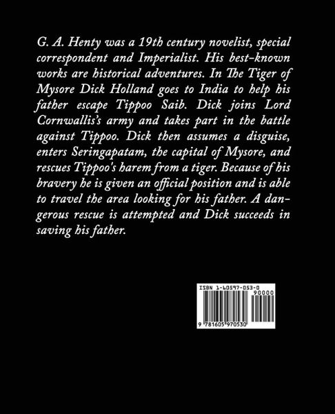 G A Henty was a 19th century novelist, special correspondent and Imperialist. His best-known works are historical adventures. In The Tiger of Mysore Dick Holland goes to India to help his father escape Tippoo Saib. Dick joins Lord Cornwallis's army and takes part in the battle against Tippoo. Dick then assumes a disguise, enters Seringapatam, the capital of Mysore, and rescues Tippoo's harem from a tiger. Because of his bravery he is given an official position and is able to travel the area looking for his father. A dangerous rescue is attempted and Dick succeeds in saving his father.