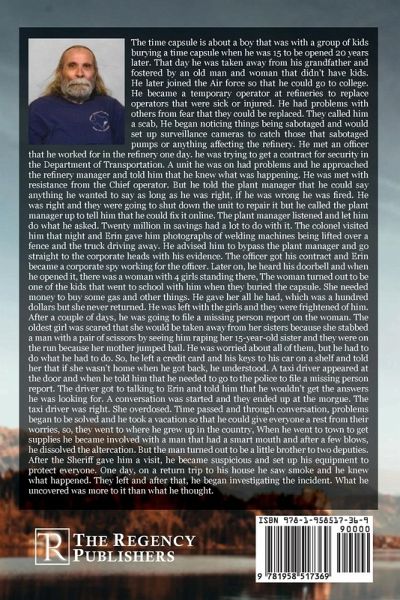 The time capsule is about a boy that was with a group of kids burying a time capsule when he was 15 to be opened 20 years later. That day he was taken away from his grandfather and fostered by an old man and woman that didn't have kids. He later joined the Air force so that he could go to college. He became a temporary operator at refineries to replace operators that were sick or injured. He had problems with others from fear that they could be replaced. They called him a scab, He began noticing things being sabotaged and would set up surveillance cameras to catch those that sabotaged pumps or anything affecting the refinery. He met an officer that he worked for in the refinery one day. he was trying to get a contract for security in the Department of Transportation. A unit he was on had problems and he approached the refinery manager and told him that he knew what was happening. He was met with resistance from the Chief operator. But he told the plant manager that he could say anything he wanted to say as long as he was right, if he was wrong he was fired. He was right and they were going to shut down the unit to repair it but he called the plant manager up to tell him that he could fix it online. The plant manager listened and let him do what he asked. Twenty million in savings had a lot to do with it. The colonel visited him that night and Erin gave him photographs of welding machines being lifted over a fence and the truck driving away. He advised him to bypass the plant manager and go straight to the corporate heads with his evidence. The officer got his contract and Erin became a corporate spy working for the officer. Later on, he heard his doorbell and when he opened it, there was a woman with 4 girls standing there, The woman turned out to be one of the kids that went to school with him when they buried the capsule. She needed money to buy some gas and other things. He gave her all he had, which was a hundred dollars but she never returned. He was left with the girls and they were frightened of him. After a couple of days, he was going to file a missing person report on the woman. The oldest girl was scared that she would be taken away from her sisters because she stabbed a man with a pair of scissors by seeing him raping her 15-year-old sister and they were on the run because her mother jumped bail. He was worried about all of them, but he had to do what he had to do. So, he left a credit card and his keys to his car on a shelf and told her that if she wasn't home when he got back, he understood. A taxi driver appeared at the door and when he told him that he needed to go to the police to file a missing person report. The driver got to talking to Erin and told him that he wouldn't get the answers he was looking for. A conversation was started and they ended up at the morgue. The taxi driver was right. She overdosed. Time passed and through conversation, problems began to be solved and he took a vacation so that he could give everyone a rest from their worries, so, they went to where he grew up in the country, When he went to town to get supplies he became involved with a man that had a smart mouth and after a few blows, he dissolved the altercation. But the man turned out to be a little brother to two deputies. After the Sheriff gave him a visit, he became suspicious and set up his equipment to protect everyone. One day, on a return trip to his house he saw smoke and he knew what happened. They left and after that, he began investigating the incident. What he uncovered was more to it than what he thought.