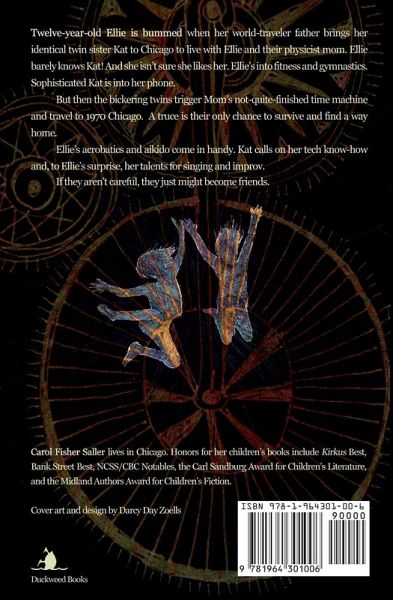 Long-separated identical twins Ellie and Kat are practically strangers when they accidentally launch themselves into the past with their inventor mother's half-finished time machine. A truce is the only way to survive and find a way home. Not that 1970 Chicago is so bad. Their supercool young hippie grandma is there, plus a new friend who might be a genius, and 10-cent Snickers! But home is home. Seeking help at a university physics department, they end up exposing their tiny time machine to the greedy gaze of Professor Wilkes Lavin. When Lavin swipes the machine for his own schemes, Ellie and Kat resolve to think like scientists and do whatever it takes to get home. In tricky situations, escapes, and sometimes just for fun, the sisters make the most of their identical twinness. Ellie's acrobatics and aikido come in handy; Kat calls on her tech know-how and, to Ellie's surprise, hidden talents for singing and improv. If they aren't careful, they just might become friends!