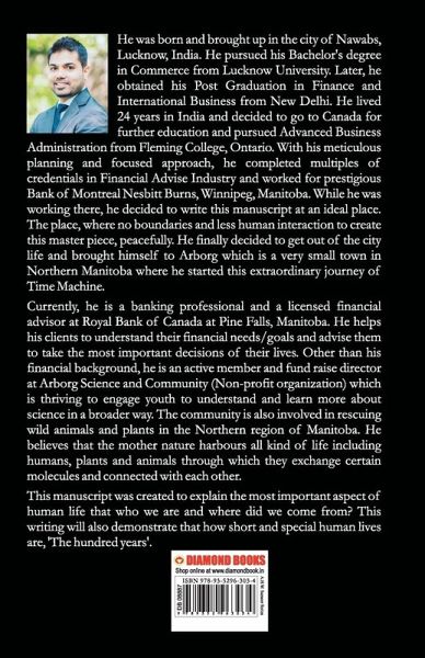 He was born and brought up in the city of Nawabs, Lucknow, India. He pursued his Bachelor's degree in Commerce from Lucknow University. Later, he obtained his Post Graduation in Finance and International Business from New Delhi. He lived 24 years in India and decided to go to Canada for further education and pursued Advanced Business Administration from Fleming College, Ontario. With his meticulous planning and focused approach, he completed multiples of credentials in Financial Advise Industry and worked for prestigious Bank of Montreal Nesbitt Burns, Winnipeg, Manitoba. While he was working there, he decided to write this manuscript at an ideal place. The place, where no boundaries and less human interaction to create this master piece, peacefully. He finally decided to get out of the city life and brought himself to Arborg which is a very small town in Northern Manitoba where he started this extraordinary journey of Time Machine. Currently, he is a banking professional and a licensed financial advisor at Royal Bank of Canada at Pine Falls, Manitoba. He helps his clients to understand their financial needs/goals and advise them to take the most important decisions of their lives. Other than his financial background, he is an active member and fund raise director at Arborg Science and Community (Non-profit organization) which is thriving to engage youth to understand and learn more about science in a broader way. The community is also involved in rescuing wild animals and plants in the Northern region of Manitoba. He believes that the mother nature harbours all kind of life including humans, plants and animals through which they exchange certain molecules and connected with each other. This manuscript was created to explain the most important aspect of human life that who we are and where did we come from? This writing will also demonstrate that how short and special human lives are, 'The hundred years'.