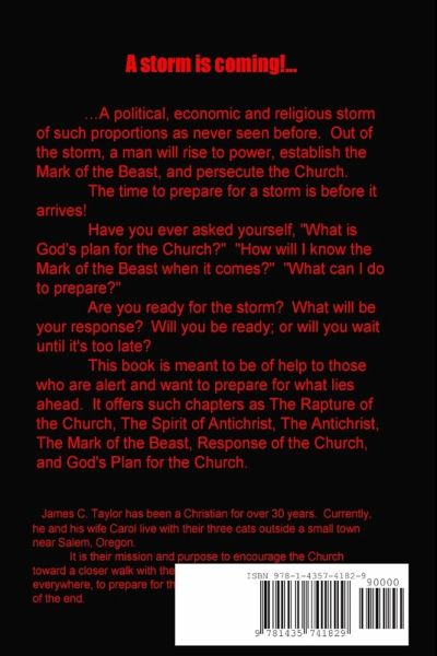 A storm is coming! A political, economic and religious storm of such proportions as never seen before. Out of the storm, a man will rise to power, establish the Mark of the Beast, and persecute the Church. The time to prepare for a storm is before it arrives! Have you ever asked yourself, "What is God's Plan for the Church?" "How will I know the Mark of the Beast when it comes?" "What can I do to prepare?" Are you ready for the storm? What will be your response? Will you be ready; or will you wait until it's too late? This book is meant to be of help to those who are alert and want to prepare for what lies ahead. It offers such chapters as The Rapture of the Church, The Spirit of Antichrist, The Antichrist, The Mark of the Beast, Response of the Church, and God's Plan for the Church.