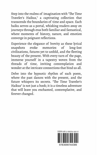 Step into the realms of imagination with "The Time Traveler's Haikus," a captivating collection that transcends the boundaries of time and space. Each haiku serves as a portal, whisking readers away on journeys through eras both familiar and fantastical, where moments of history, nature, and emotion converge in poignant reflections. Experience the elegance of brevity as these lyrical snapshots evoke memories of long-lost civilizations, futures yet to unfold, and the fleeting beauty of the present. With every turn of the page, immerse yourself in a tapestry woven from the threads of time, inviting contemplation and wonder at the intricate connections that bind us all. Delve into the hypnotic rhythm of each poem, where the past dances with the present, and the future whispers its secrets. "The Time Traveler's Haikus" is not just a book; it is a timeless adventure that will leave you enchanted, contemplative, and forever changed.