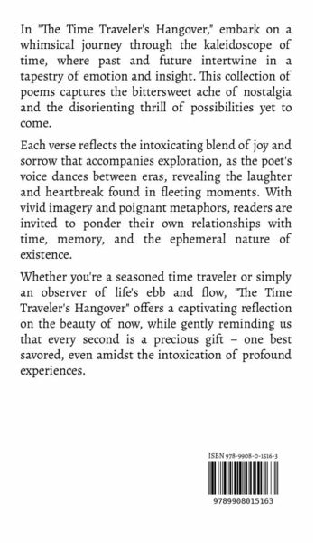 In "The Time Traveler's Hangover," embark on a whimsical journey through the kaleidoscope of time, where past and future intertwine in a tapestry of emotion and insight. This collection of poems captures the bittersweet ache of nostalgia and the disorienting thrill of possibilities yet to come. Each verse reflects the intoxicating blend of joy and sorrow that accompanies exploration, as the poet's voice dances between eras, revealing the laughter and heartbreak found in fleeting moments. With vivid imagery and poignant metaphors, readers are invited to ponder their own relationships with time, memory, and the ephemeral nature of existence. Whether you're a seasoned time traveler or simply an observer of life's ebb and flow, "The Time Traveler's Hangover" offers a captivating reflection on the beauty of now, while gently reminding us that every second is a precious gift - one best savored, even amidst the intoxication of profound experiences.