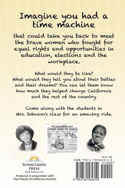 Students in Mrs. Johnson's class travel via a time machine into the past to meet California women who fought for the right to vote, to own property, to serve in politics and to practice law. In groups of three, they research the women's stories and arrive back in time to interview politicians, businesswomen, and activists, some famous and some they hope will be. They meet with former slaves, Asian- and Hispanic-Americans who made money in real estate, ran businesses, fought discrimination, and funded schools and churches to help black children and the poor. They learn about the women who fought for the right to practice law and attend law school. Many of these women from all races fought for women's right to vote, worker's rights, and successful elections to state and federal offices. They also worked to improve California's environment and preserve its treasures.