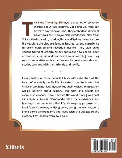 The Time Travelling Siblings is a series of six short stories about two siblings, Jack and Jill, who can travel to any place or time. They embark on different adventures to six major cities worldwide: New York, Tokyo, Rio de Janeiro, London, Paris and Sydney. In each story, they explore the city, see famous landmarks, and experience different cultures and historical events. They also enjoy various forms of entertainment and meet new people. Each adventure is unique and teaches them something new. They return home after each experience with great memories and stories to share with their friends and family.