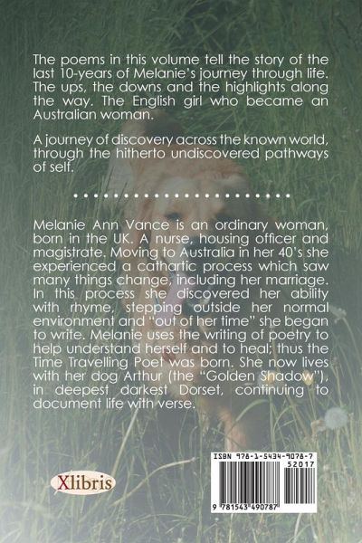 Melanie Ann Vance is a just an ordinary woman born in the UK, a nurse, housing officer and magistrate. In her 40s she moved to Australia and during this cathartic process which saw many things change, including her marriage, she discovered her ability with rhyme. Stepping outside her normal environment out of her time if you like she began to write. She uses the writing of poetry to understand herself and to heal, and so the time travelling poet was born. She now lives with her dog, Arthur (her Golden Shadow), in deepest darkest Dorset and continues to document life with verse.