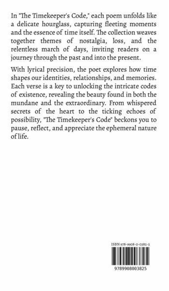 In "The Timekeeper's Code," each poem unfolds like a delicate hourglass, capturing fleeting moments and the essence of time itself. The collection weaves together themes of nostalgia, loss, and the relentless march of days, inviting readers on a journey through the past and into the present. With lyrical precision, the poet explores how time shapes our identities, relationships, and memories. Each verse is a key to unlocking the intricate codes of existence, revealing the beauty found in both the mundane and the extraordinary. From whispered secrets of the heart to the ticking echoes of possibility, "The Timekeeper's Code" beckons you to pause, reflect, and appreciate the ephemeral nature of life.
