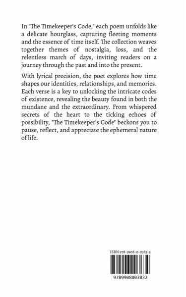In "The Timekeeper's Code," each poem unfolds like a delicate hourglass, capturing fleeting moments and the essence of time itself. The collection weaves together themes of nostalgia, loss, and the relentless march of days, inviting readers on a journey through the past and into the present. With lyrical precision, the poet explores how time shapes our identities, relationships, and memories. Each verse is a key to unlocking the intricate codes of existence, revealing the beauty found in both the mundane and the extraordinary. From whispered secrets of the heart to the ticking echoes of possibility, "The Timekeeper's Code" beckons you to pause, reflect, and appreciate the ephemeral nature of life.