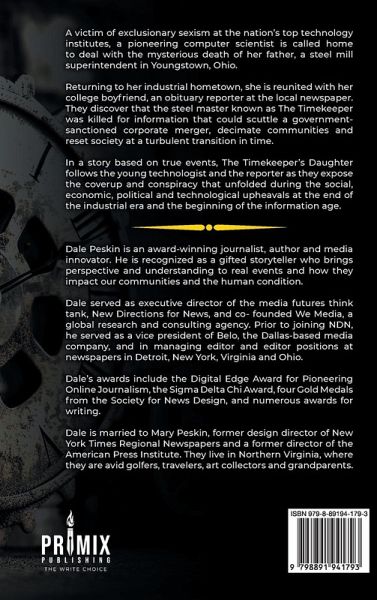 A victim of exclusionary sexism at the nation's top technology institutes, a pioneering computer scientist is called home to deal with the mysterious death of her father, a steel mill superintendent in Youngstown, Ohio. Returning to her industrial hometown, she is reunited with her college boyfriend, an obituary reporter at the local newspaper. They discover that the steel master known as The Timekeeper was killed for information that could scuttle a government-sanctioned corporate merger, decimate communities and reset society at a turbulent transition in time. In a story based on true events, The Timekeeper's Daughter follows the young technologist and the reporter as they expose the coverup and conspiracy that unfolded during the social, economic, political and technological upheavals at the end of the industrial era and the beginning of the information age.