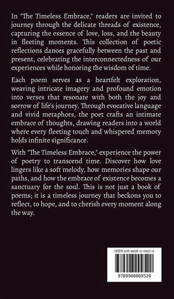 In "The Timeless Embrace," readers are invited to journey through the delicate threads of existence, capturing the essence of love, loss, and the beauty in fleeting moments. This collection of poetic reflections dances gracefully between the past and present, celebrating the interconnectedness of our experiences while honoring the wisdom of time. Each poem serves as a heartfelt exploration, weaving intricate imagery and profound emotion into verses that resonate with both the joy and sorrow of life's journey. Through evocative language and vivid metaphors, the poet crafts an intimate embrace of thoughts, drawing readers into a world where every fleeting touch and whispered memory holds infinite significance. With "The Timeless Embrace," experience the power of poetry to transcend time. Discover how love lingers like a soft melody, how memories shape our paths, and how the embrace of existence becomes a sanctuary for the soul. This is not just a book of poems; it is a timeless journey that beckons you to reflect, to hope, and to cherish every moment along the way.