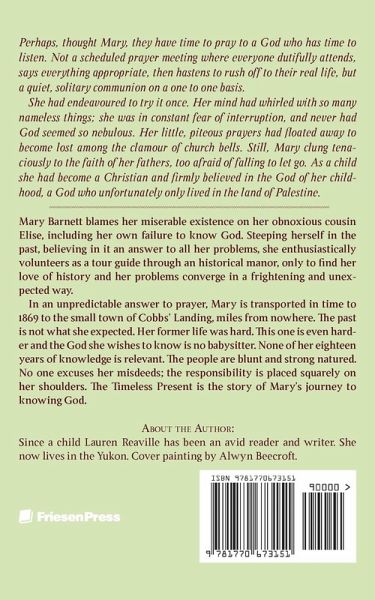 Mary Barnett blames her miserable existence on her obnoxious cousin Elise, including her own failure to know God. Steeping herself in the past, believing in it an answer to all her problems, she enthusiastically volunteers as a tour guide through an historical manor, only to find her love of history and her problems converge in a frightening and unexpected way. In an unpredictable answer to prayer, Mary is transported in time to 1869 to the small town of Cobbs' Landing, miles from nowhere. The past is not what she expected. Her former life was hard. This one is even harder and the God she wishes to know is no babysitter. None of her eighteen years of knowledge is relevant. The people are blunt and strong natured. No one excuses her misdeeds; the responsibility is placed squarely on her shoulders. The Timeless Present is the story of Mary's journey to knowing God.