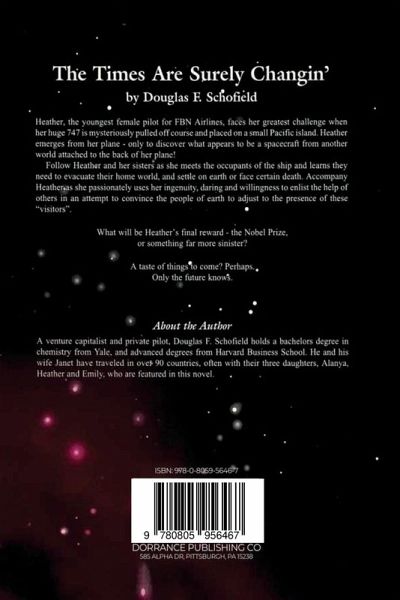 Heather, the youngest female pilot for FBN Airlines, faces her greatest challenge when her huge 747 is mysteriously pulled off course and placed on a small Pacific island. Heather emerges from her plane only to discover what appears to be a spacecraft from another world attached to the back of her plane! Follow Heather and her sisters as she meets the occupants of the ship and learns they need to evacuate their home world and settle on earth or face certain death. Accompany Heather as she passionately uses her ingenuity, daring, and willingness to enlist the help of others in an attempt to convince the people of earth to adjust to the presence of these visitors. What will be Heathers final reward the Nobel Prize, or something far more sinister? A taste of things to come? Perhaps. Only the future knows. About the Author A venture capitalist and private pilot, Douglas F. Schofield holds a bachelors degree in chemistry from Yale, and advanced degrees from Harvard Business School. He and his wife Janet have traveled in over 90 countries, often with their three daughters, Alanya, Heather, and Emily, who are featured in this novel.