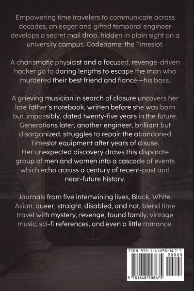 Empowering time travelers to communicate across decades, an eager and gifted temporal engineer develops a secret mail drop, hidden in plain sight on a university campus. Codename: the Timeslot. A charismatic physicist and a focused, revenge-driven hacker go to daring lengths to escape the man who murdered their best friend and fiancé-his boss. A grieving musician in search of closure uncovers her late father's notebook, written before she was born but, impossibly, dated twenty-five years in the future. Generations later, another engineer, brilliant but disorganized, struggles to repair the abandoned Timeslot equipment after years of disuse. Her unexpected discovery draws this disparate group of men and women into a cascade of events which echo across a century of recent-past and near-future history. Journals from five intertwining lives, Black, White, Asian, queer, straight, disabled, and not, blend time travel with mystery, revenge, found family, vintage music, sci-fi references, and even a little romance.