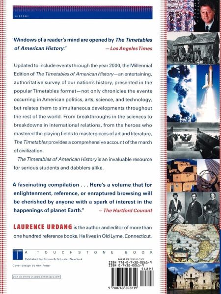 Updated to include events through the year 2000, the Millennial Edition of The Timetables of American History -- an entertaining, authoritative survey of our nation's history, presented in the popular Timetables format -- not only chronicles the events occurring in American politics, arts, science, and technology, but relates them to simultaneous developments throughout the rest of the world. From breakthroughs in the sciences to breakdowns in international relations, from the heroes who mastered the playing fields to masterpieces of art and literature, The Timetables provides a comprehensive account of the march of civilization. The Timetables of American History is an invaluable resource for serious students and dabblers alike.