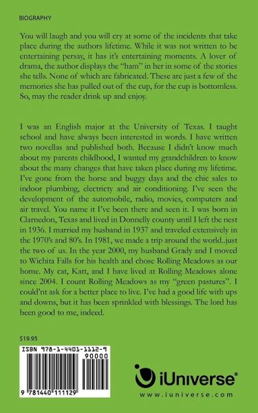 You will laugh and you will cry at some of the incidents that take place during the authors lifetime. While it was not written to be entertaining persay, it has it's entertaining moments. A lover of drama, the author displays the "ham" in her in some of the stories she tells. None of which are fabricated. These are just a few of the memories she has pulled out of the cup, for the cup is bottomless. So, may the reader drink up and enjoy.