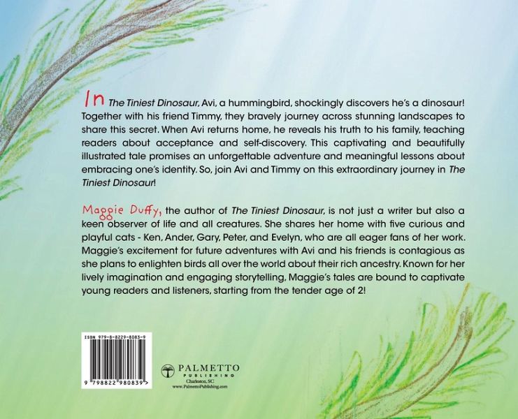 Avi, a Hummingbird with a Big Secret, Discovers He's a Dinosaur! Join Him and His Pal Timmy as They Spread the News to Feathery Friends Globally. A Heartwarming Family Tale of Identity and Adventure! In the enchanting pages of The Tiniest Dinosaur, embark on an unforgettable journey with Avi, a seemingly ordinary hummingbird with an extraordinary secret. Avi isn't just any ordinary bird; he's a dinosaur! His world turns upside down when he stumbles upon this fascinating truth about his identity. This delightful tale captures his mission of sharing this news, and you're invited to join Avi and his best friend, Timmy, on this incredible adventure! As the story unravels, Avi and Timmy take to the skies, eager to share this revelation with their avian acquaintances across the globe. From the lush forests of South America to the highest peaks of the Himalayas, our brave duo soars through diverse landscapes, meeting fascinating characters along the way. Will they be able to convince the bird community of Avi's unique lineage? Upon their return home, Avi must share his secret with his loved ones. His parents and his sister, Charlie, are taken aback at first, but they soon realize that no matter what, Avi is still the same beloved hummingbird at heart. This story beautifully explores the themes of self-discovery, acceptance, and the unconditional love of family. The Tiniest Dinosaur is a captivating tale that will ignite the imagination of young readers while teaching them about the importance of embracing one's identity. The vibrant illustrations and engaging narrative make this book a treasure for children and parents alike. So, spread your wings and prepare for a thrilling flight with Avi and Timmy in The Tiniest Dinosaur! An enthralling adventure awaits in every turn of the page, an adventure that promises to be as exciting as it is enlightening. Jump in and discover the wondrous world of Avi, the hummingbird dinosaur!