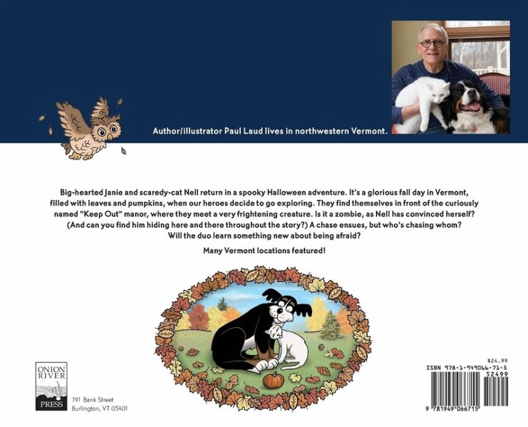 Big-hearted Janie and scaredy-cat Nell return in a spooky Halloween adventure. It's a glorious fall day in Vermont, filled with leaves and pumpkins, when our heroes decide to go exploring. They find themselves in front of the curiously named "Keep Out" manor, where they meet a very frightening creature. Is it a zombie, as Nell has convinced herself? (And can you find him hiding here and there throughout the story?) A chase ensues, but who's chasing whom? Will the duo learn something new about being afraid? Many Vermont locations featured!