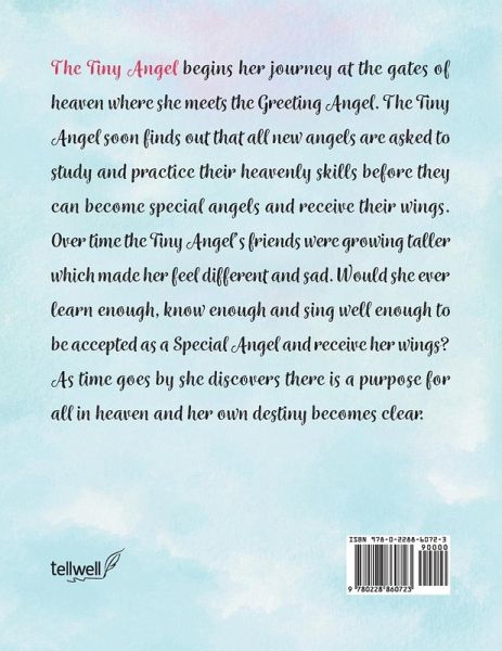 The Tiny Angel begins her journey at the gates of heaven where she meets the Greeting Angel. The Tiny Angel soon finds out that all new angels are asked to study and practice their heavenly skills before they can become special angels and receive their wings. Over time the Tiny Angel's friends were growing taller which made her feel different and sad. Would she ever learn enough, know enough and sing well enough to be accepted as a Special Angel and receive her wings? As time goes by she discovers there is a purpose for all in heaven and her own destiny becomes clear.