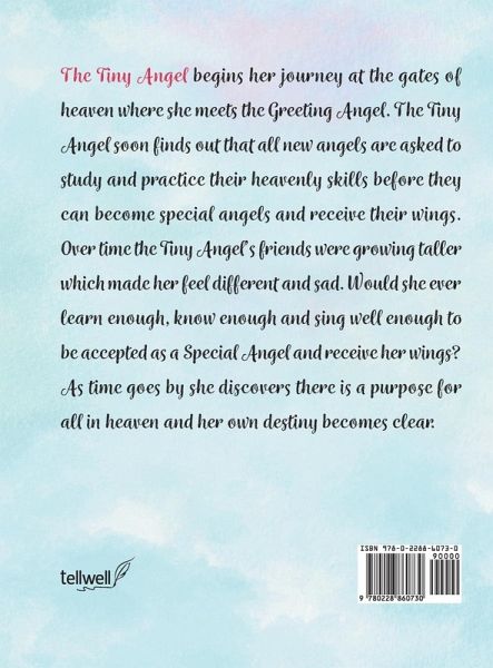 The Tiny Angel begins her journey at the gates of heaven where she meets the Greeting Angel. The Tiny Angel soon finds out that all new angels are asked to study and practice their heavenly skills before they can become special angels and receive their wings. Over time the Tiny Angel's friends were growing taller which made her feel different and sad. Would she ever learn enough, know enough and sing well enough to be accepted as a Special Angel and receive her wings? As time goes by she discovers there is a purpose for all in heaven and her own destiny becomes clear.